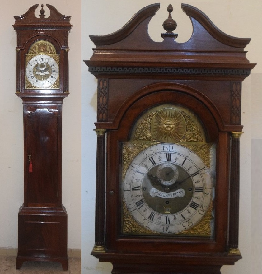19th C. Mahogany longcase clock, Roman numerals, chiming on 8 bells
