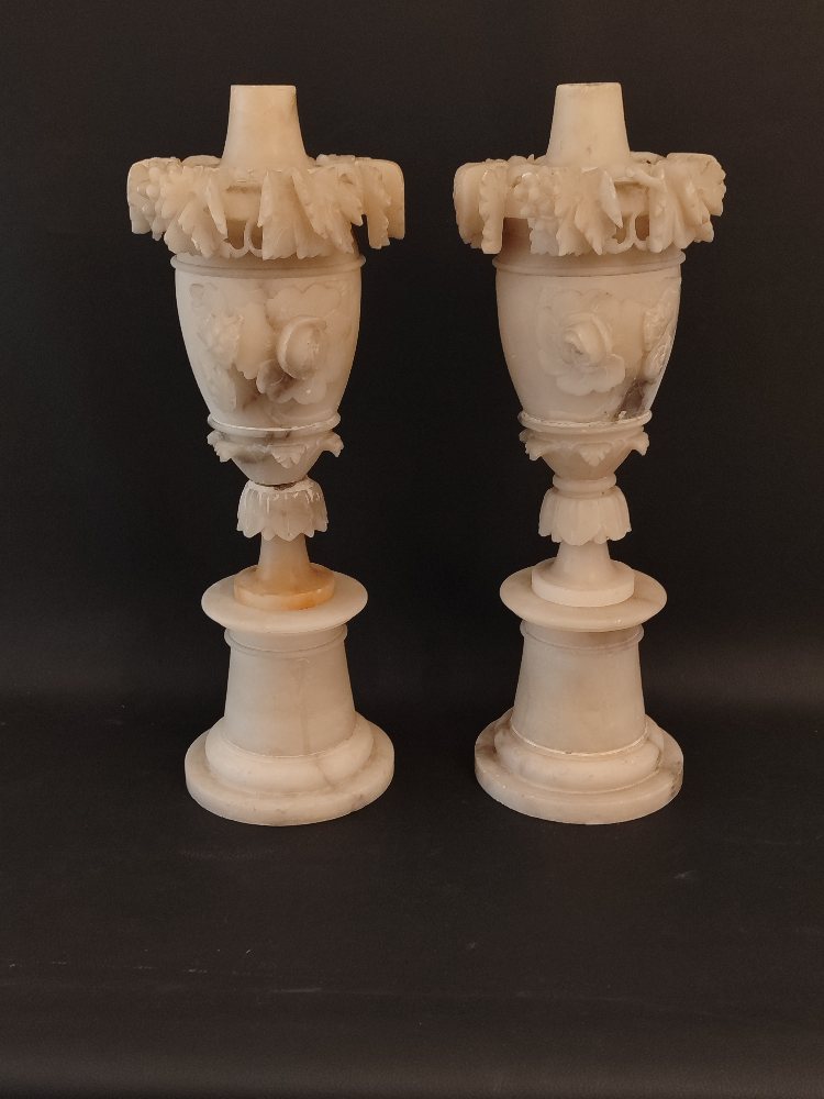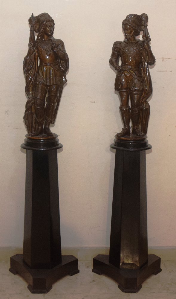 Terracotta pair male figures, patinated bronze, on ebonised hexagonal columns, 135cms