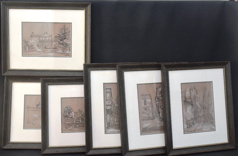 A. M. Galea, 6, pen drawings and water colour ‘ Malta Scenes’ 26x17cms, signed, dated and framed