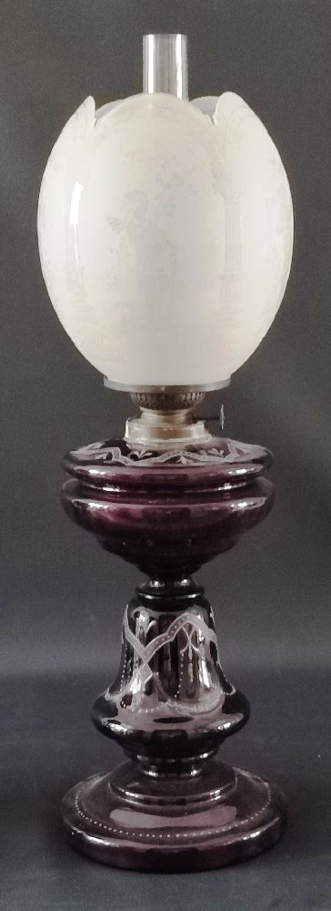 Late 19th C. ruby glass paraffin lamp with opaque glass shade