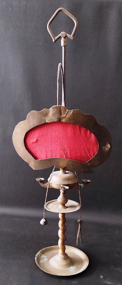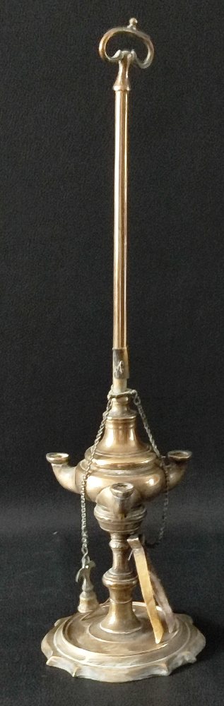 Old brass library oil lamp, 4 burner with shield and 3 tools