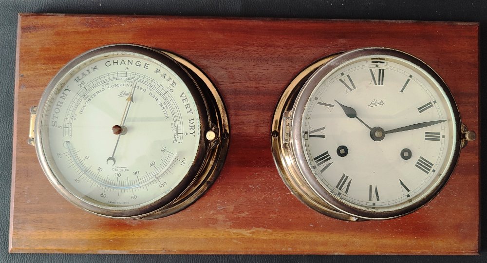 SCHATZ brass cased marine clock and barometer on mahogany plaque