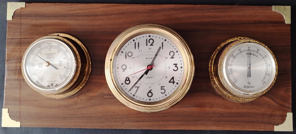 Brass cased clock, barometer and hygrometer on mahogany plaque