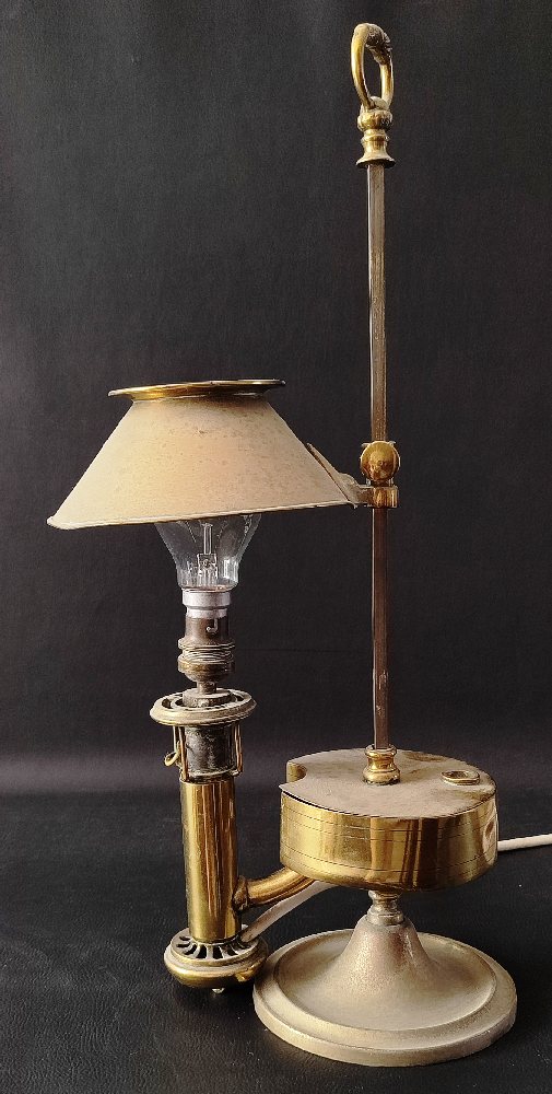 Late 19th C. brass paraffin library oil lamp with reservoir and shade, converted for electricity
