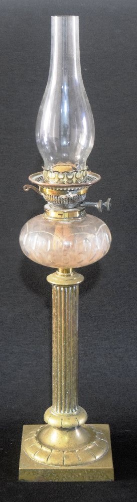 19th C. Brass double wick paraffin lamp, with clear glass font