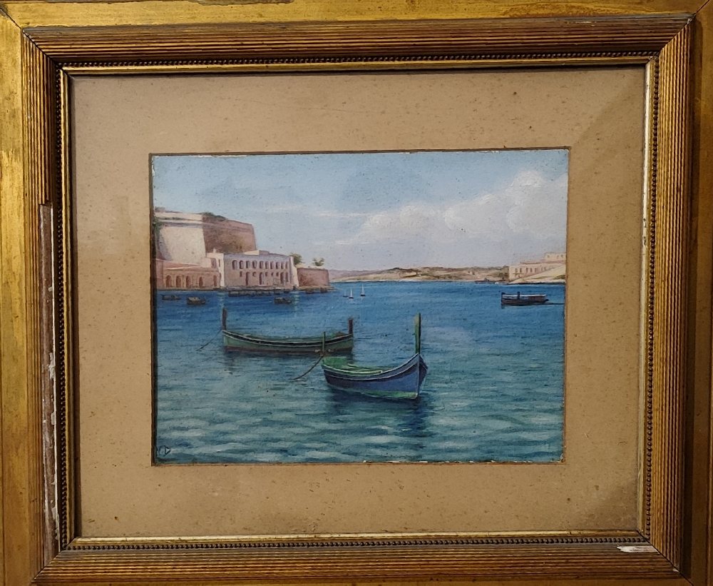 Early 20th C. Gouache painting: Marsamxetto Harbour from Valletta, signed in monogram ND, 29.5 x 22cm, in gilt frame