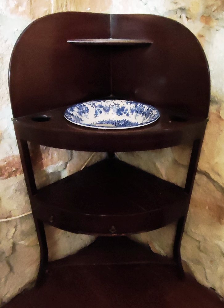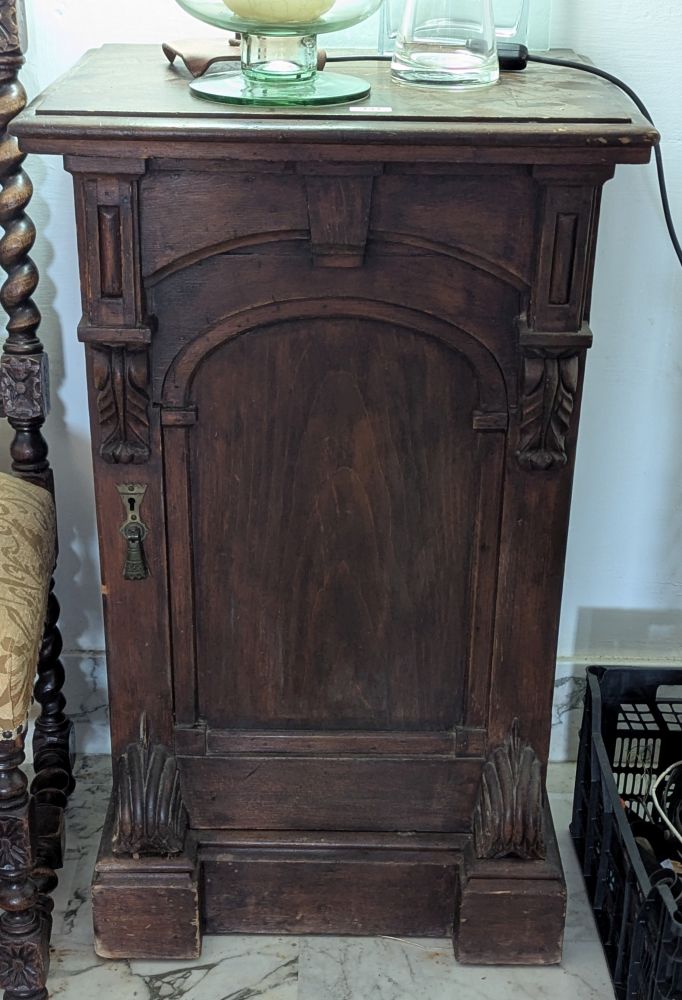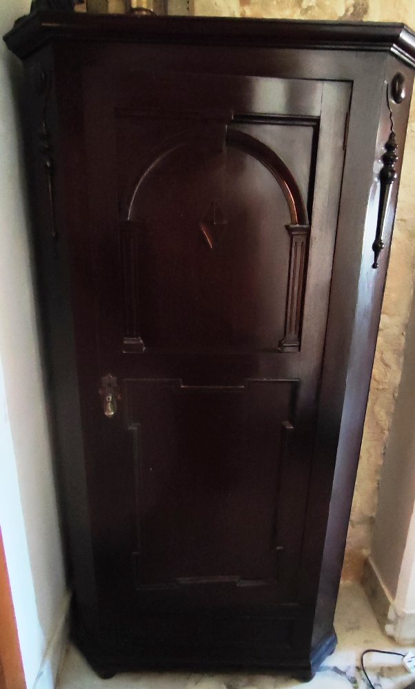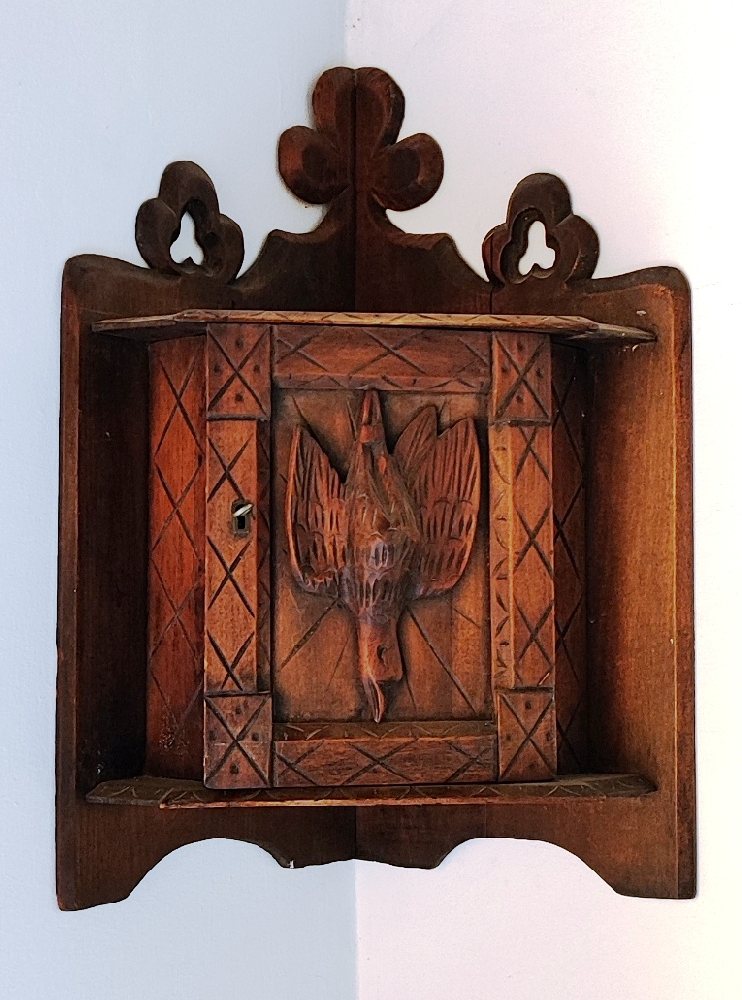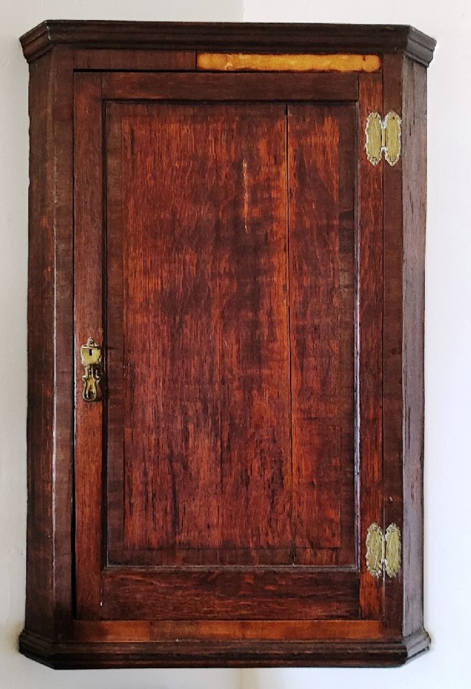 Mid 19th C. German walnut corner 2-door cupboard with drawer, inlaid with oval fret medallions, on bun feet