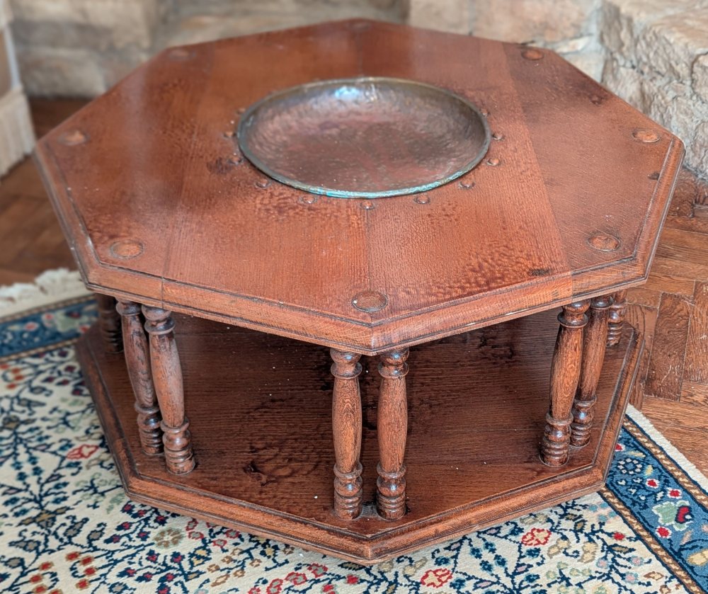 Oak hexagonal coffee table with inset copper bowl, undershelf and 18 turned columns, 82cm