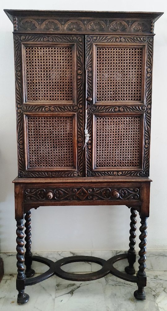 Oak cupboard with drawer and cane doors, on solomonic turned supports, 80 x 165cm