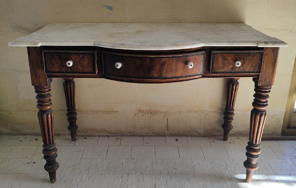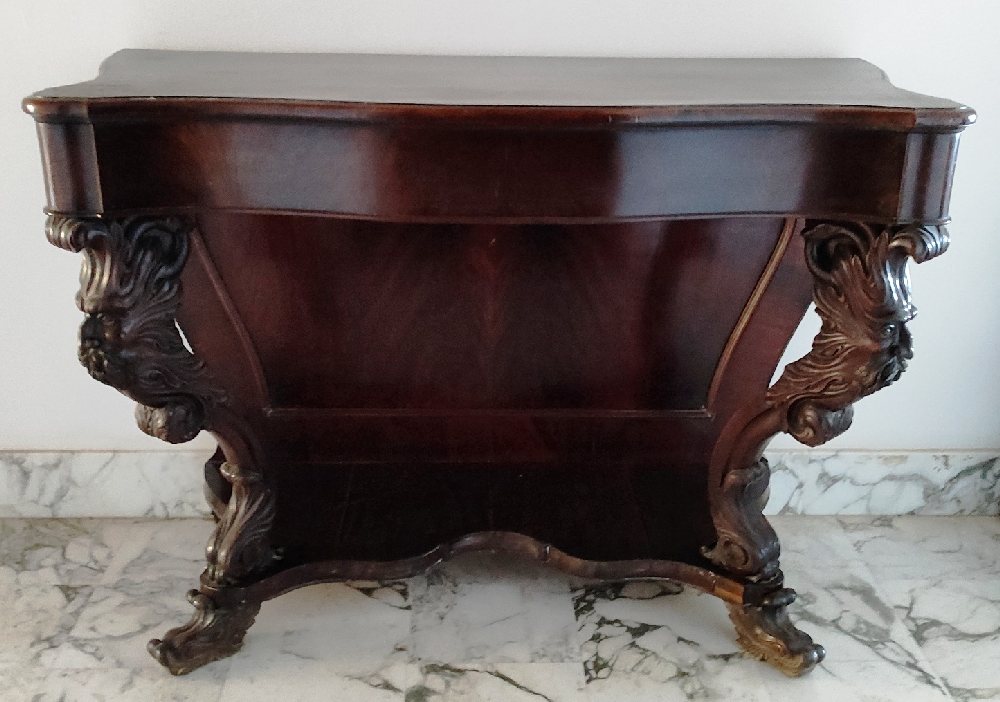 Mid 19th C. Maltese mahogany serpentine console table with under-shelf, the carved supports with masks (tal- Mustacci)
