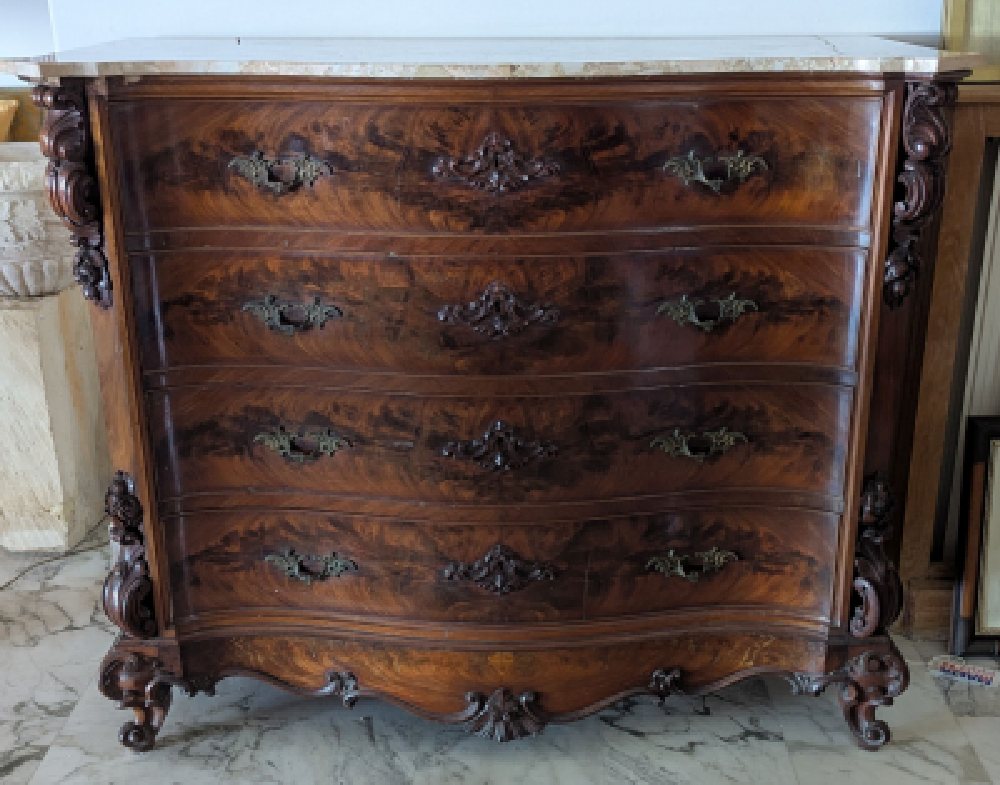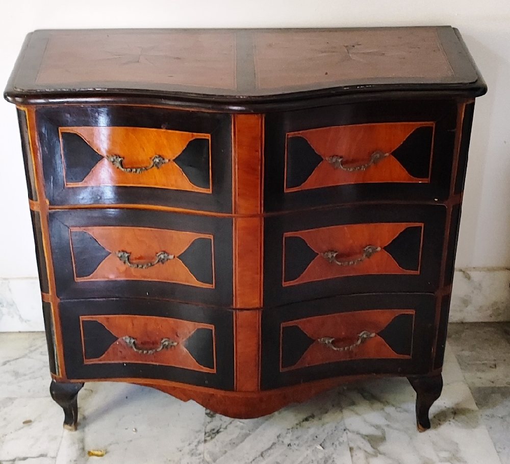 Maltese veneered mahogany and fruit wood serpentine small chest of drawers with string inlay and cross motif, ca 1960, 95cm