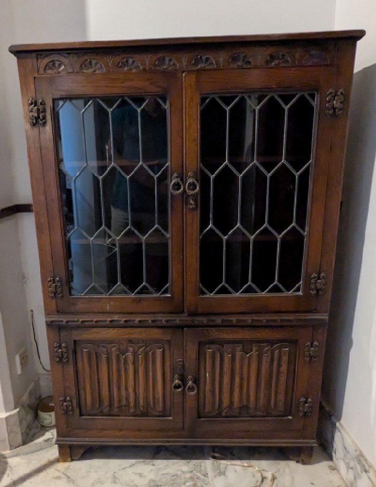 Oak 2-door showcase with lower linen fold carved panels, leaded lights, 95 x 138cm
