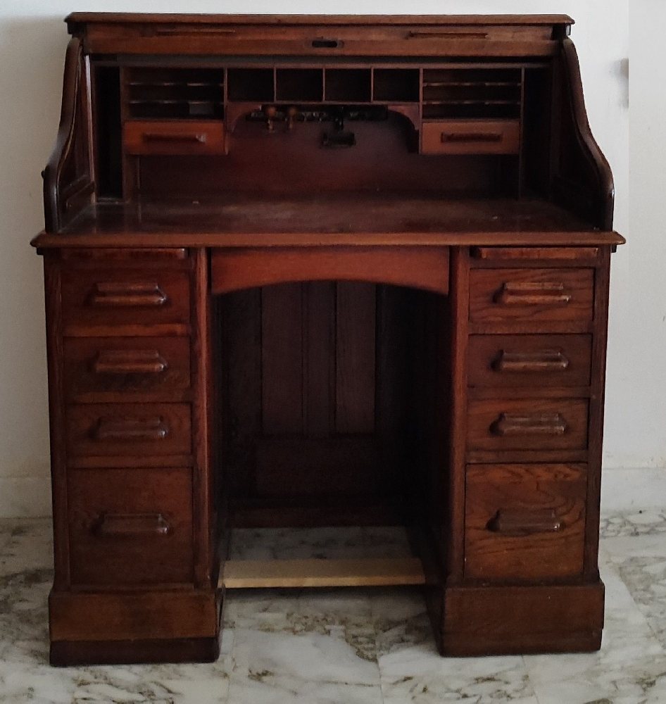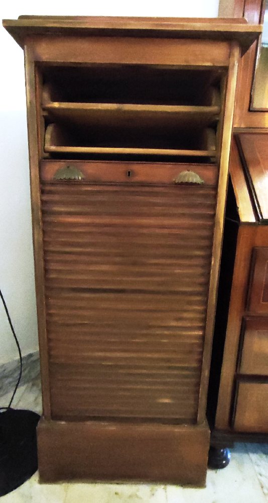 Beechwood office cabinet with 8 sliding trays and roller shutter, 55b x 130cm