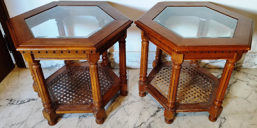 Oak pair octagonal lamp tables with bevelled glass and cane undershelf es, 60cm