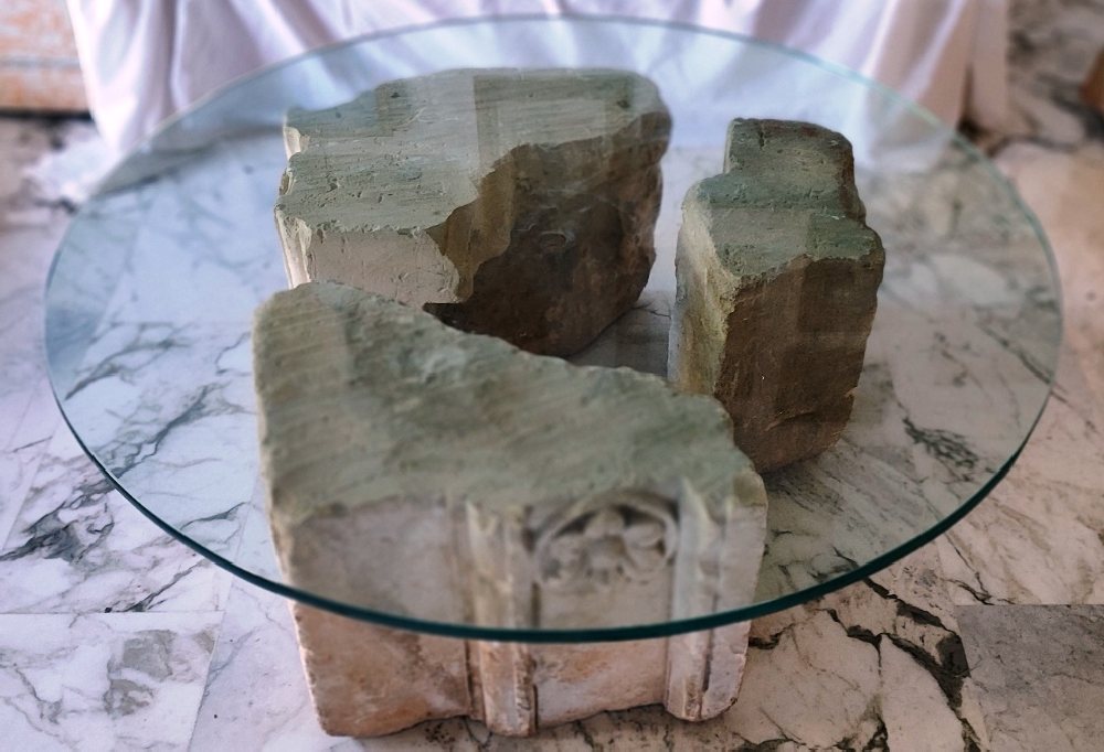 Glass topped circular coffee table set of 3 Malta 19th C. limestone architectural ornaments, 115cm