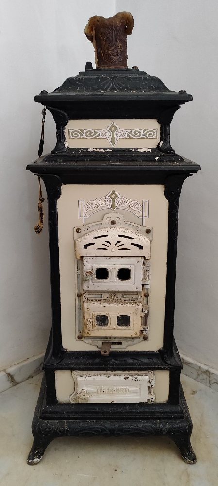 Edwardian KUOOERSBUSCH & Sohne, cast iron polychrome decorated wood / coal burning stove