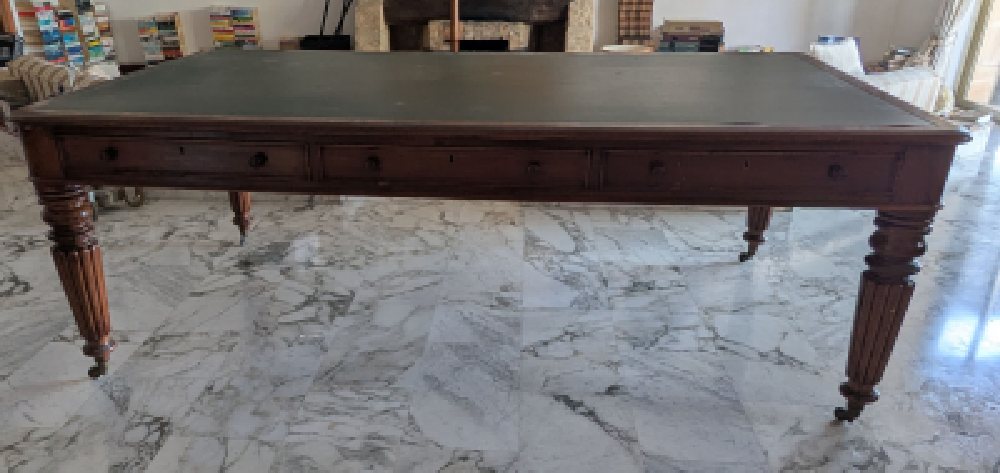 Edwardian mahogany board room table with inset green leather, 6 drawers, turned and fluted legs, brass castors, 125 x 227cm