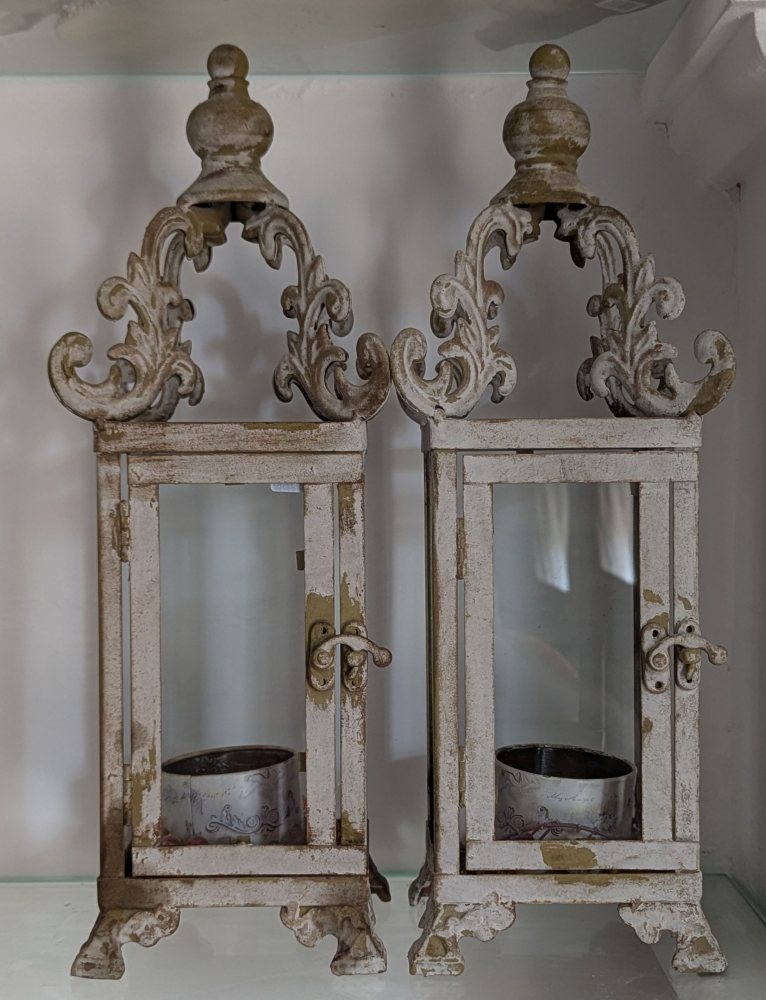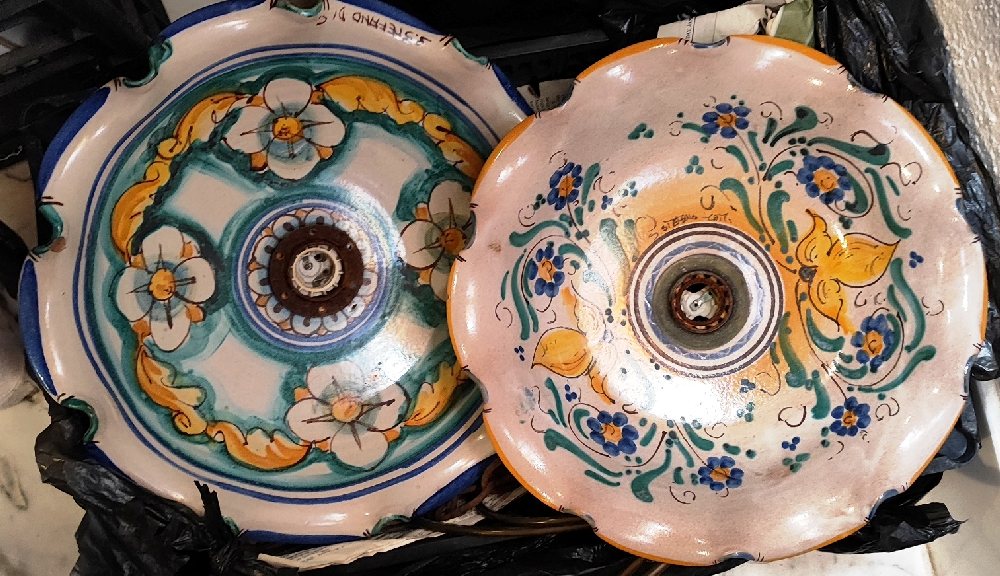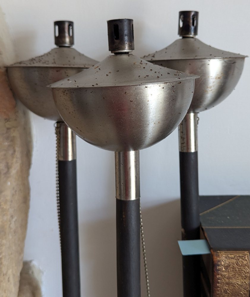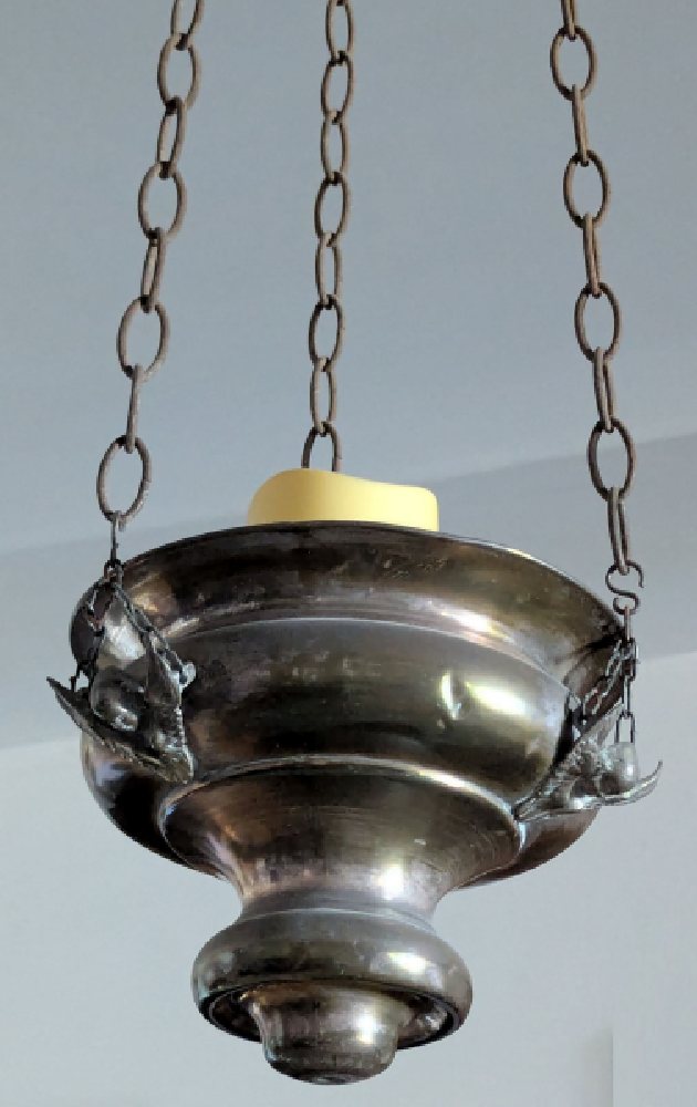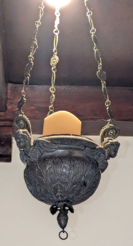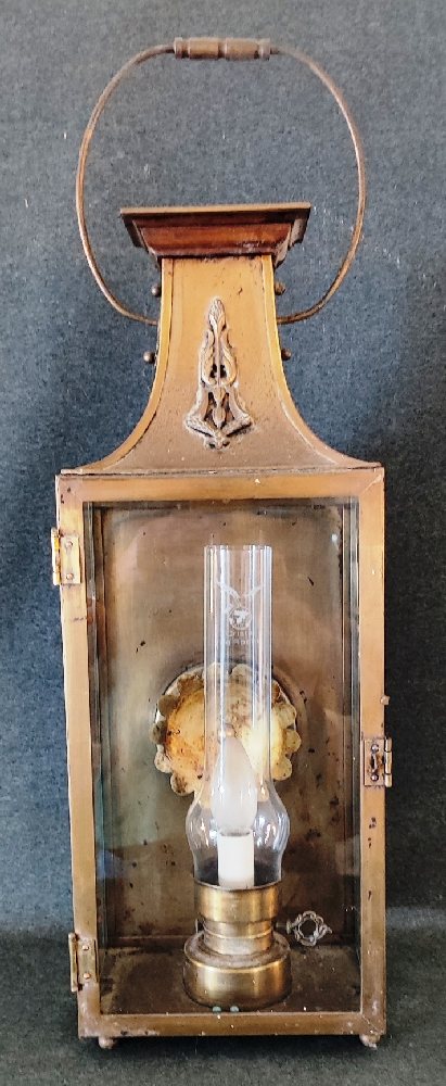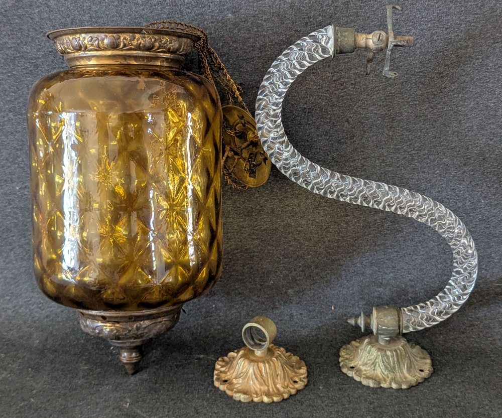 Amber glass ceiling light; 19th C. S-scroll wall light arm with bracket; paraffin lamp
