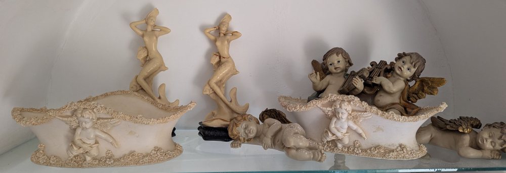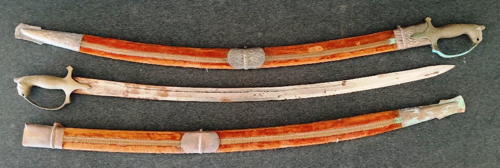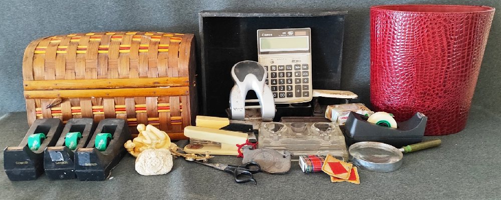 Metal napkin box, 2 bronze horses, carved wood fork & knife in case; ceremonial wood dagger, pistol lighter, etc