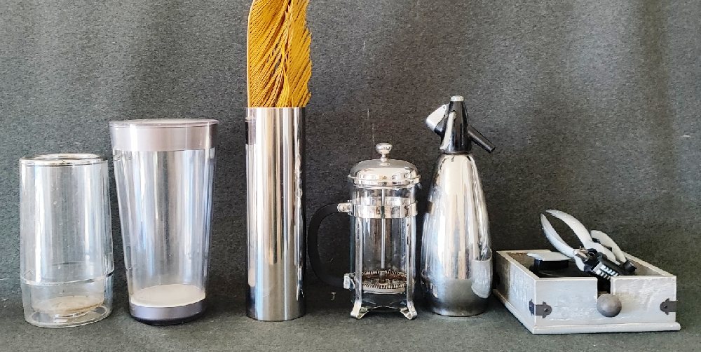 HABITAT steel vase; 2 wine coolers, corker, napkin box, syphon bottle and coffee jug