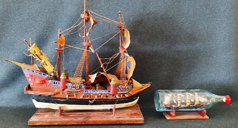 Wood polychrome decorated model of an 18th C. galleon, 49cm; and a galleon in a bottle