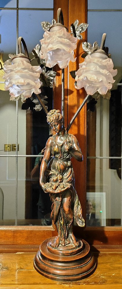 Victorian cast iron telescopic paraffin lamp with Art Nouveau ceramic reservoir