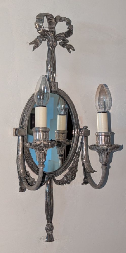 2, Silvered oval wall mirrors with twin sconces, light fittings, ornate with drapery and garlands